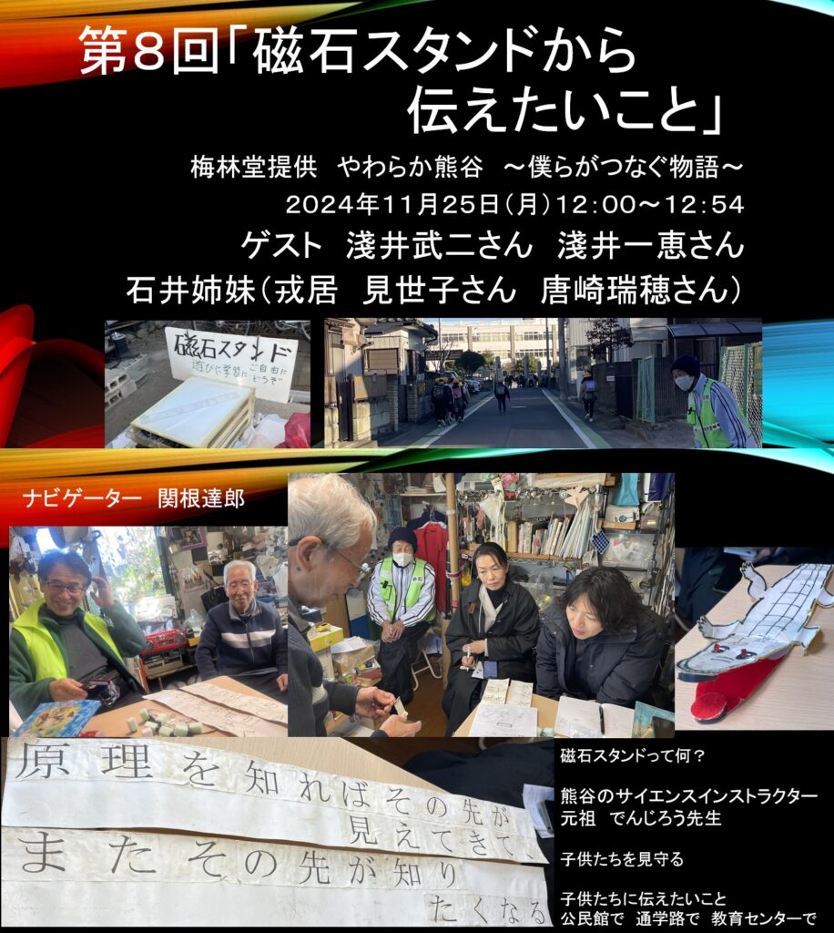 時刻は12時18分を回りました。AZ熊谷6階FMクマガヤYZコンサルティングスタジオから生放送でお送りしております。梅林堂提供「やわらか熊谷僕らがつなぐ物語」第8回「磁石スタンドから伝えたいこと」ということで引き続き磁石スタンドの話を伺って参ります。本日は淺井夫妻、武二さん一惠さんそして石井姉妹に来ていただいています。よろしくお願いします。