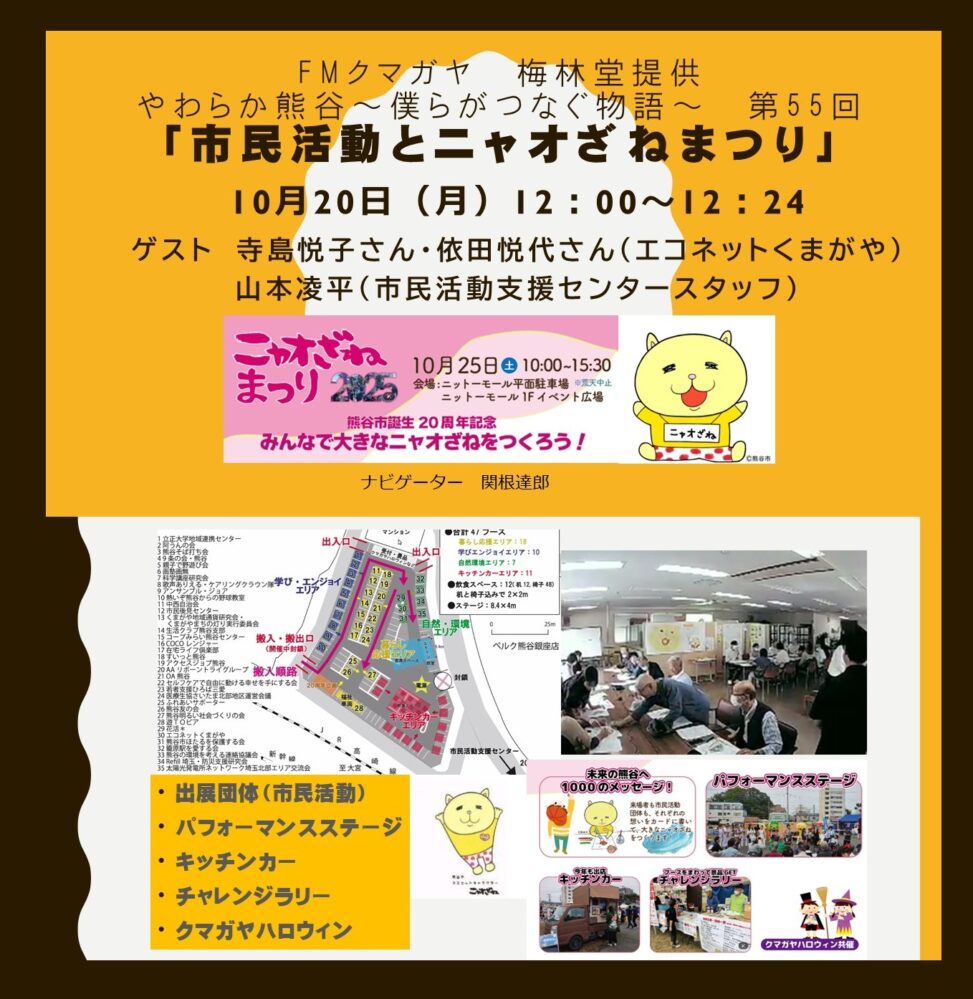 10月22日はダブル企画です。前半は第55回は10月25日(土)に行われる「ニャオざねまつり」の歴史と今年の内容を 第1回のニャオざねまつりから関わっていただいているエコネットくまがやの寺島悦子さん・依田悦代さんにそして熊谷市20周年記念イベントとして市民活動支援センター学生スタッフの山本凌平さんにお越しいただきお話を伺います。どうぞお楽しみに!