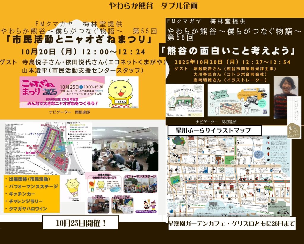 10月22日はダブル企画です。前半は第55回は10月25日(土)に行われる「ニャオざねまつり」の歴史と今年の内容を 第1回のニャオざねまつりから関わっていただいているエコネットくまがやの寺島悦子さん・依田悦代さんにそして熊谷市20周年記念イベントとして市民活動支援センター学生スタッフの山本凌平さんにお越しいただきお話を伺います。どうぞお楽しみに!