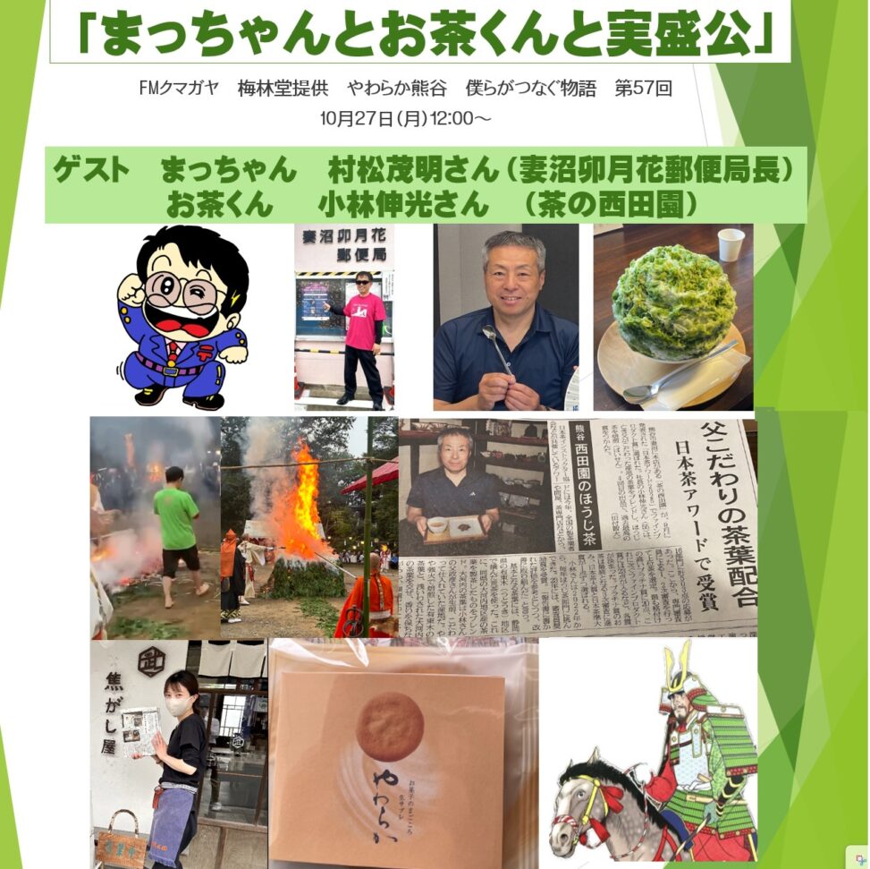 ゲストには まっちゃんこと妻沼卯月花郵便局長 村松茂明さん お茶くんこと茶の西田園 小林伸光さんに来ていただきます。