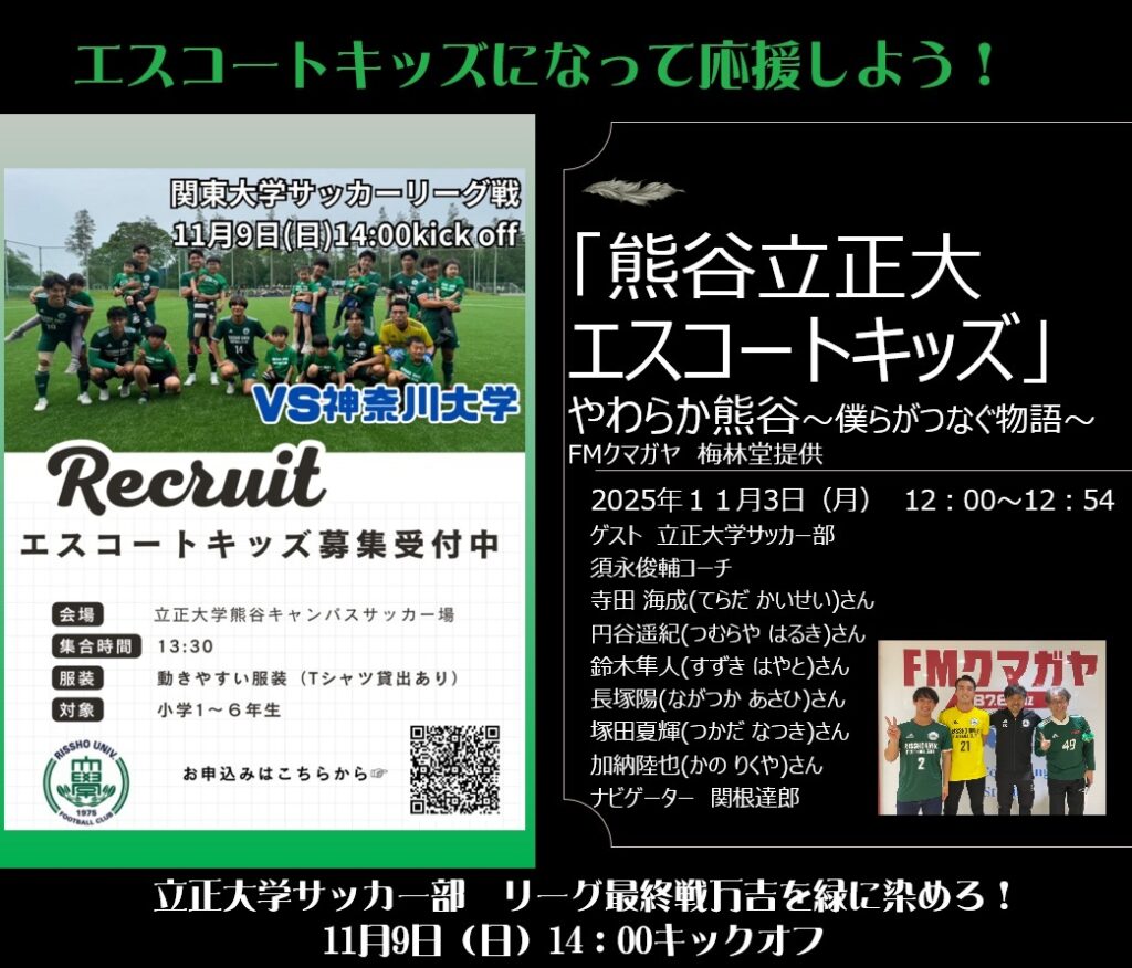 第58回「熊谷立正大エスコートキッズ」11月3日 Post Views: 3 11月3日(月)文化の日の やわらか熊谷 僕らがつなぐ物語は? 「熊谷立正大エスコートキッズ」 Jリーグにたくさんの選手を輩出している地元 立正大学熊谷キャンパスの選手が出演します。日頃の活動や先輩の声 そして熊谷に寄せる思いを伺います。どうぞお楽しみに! 2025年10月29日 投稿先 未分類 ← 過去の投稿へ コメントを残す コメントをキャンセルメールアドレスが公開されることはありません。 ※ が付いている欄は必須項目ですコメント ※ 名前 ※ メール ※ サイト 次回のコメントで使用するためブラウザーに自分の名前、メールアドレス、サイトを保存する。