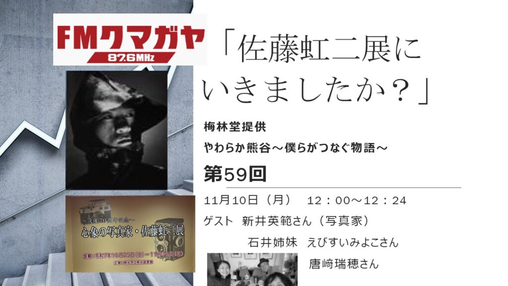 熊谷出身の写真家 新井虹二さんの写真展を改めてご紹介します。ゲストは 新井英範さん 準レギュラー 石井姉妹が登場します。佐藤虹二さんを熱く語ります。11月30日までに市立図書館に行ってください!