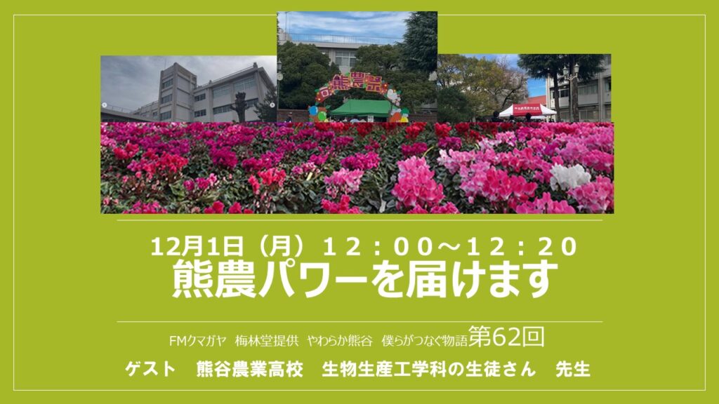 Navi 時刻は12時を回りましたAZ熊谷6階、FMクマガヤワイセットコンサルティングスタジオからお送りします。月曜のお昼は梅林堂提供、やわらか熊谷僕らがつなぐ物語をお届けいたします。今日はダブルヘッダーなんですけども、まず第1試合は第63回「熊農パワーを届けます」というタイトルでスタートしております。今日は熊谷農業高校からきていただいております。まずは久保達也先生です。こんにちは、