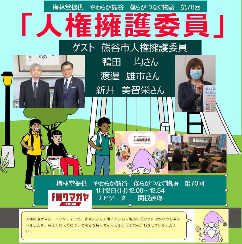 さて1月12日(月)FMクマガヤ 梅林堂提供 やわらか熊谷~僕らがつなぐ物語~は 第70回「人権擁護委員」です。ゲストは熊谷市人権擁護委員の鴨田均さん 渡邉雄市さん 新井美智榮さんです。人権擁護委員って何をしているの?3人の人権擁護委員さんの普段の活動や思いを伝えます。「人権」難しいように思える話ですが、熊谷市の人権についての話をやわらかく楽しくお伝えします。どうぞお楽しみに!