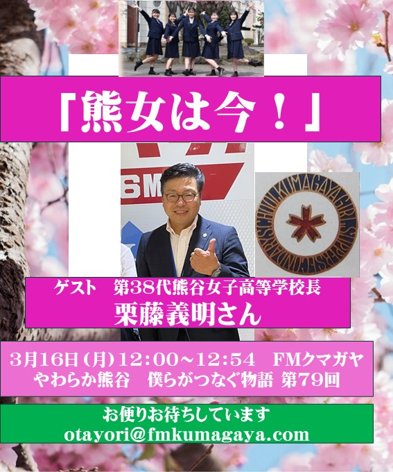 熊女関係者も そうでない人も熊女に関してお便りをお寄せください お待ちしています!otayori@fmkumagaya.com